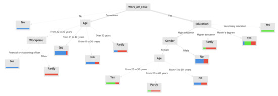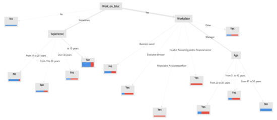 In Figure 4, the leaves represent a dependent variable, i.e., the familiarity of respondents with green accounting. Partial familiarity is highlighted in red. Blue indicates that the respondent is unfamiliar with green accounting, while red indicates that he is familiar. Each leaf is assigned an if-then rule that is viewed from left to right (first rule—first leaf left, last rule, last leaf right). Figure 4 shows that the thickness of the leaves is most pronounced in 4, 10, and 12. Additionally, it is interesting to look at leaves 3, 6, and 7. In these leaves, the number of examples (data) in the leaf makes an acceptable percentage of the class to which the leaf belongs and the probability of accuracy of the application of the rules is the same, i.e., more than 50%. By interpreting the rules relating to the leaves from Figure 4, it may be concluded that employees in tourism aged 31 to 40 years, who occasionally work on their education are not familiar with green accounting (leaf 4), as well as the male population who has a bachelor’s degree (higher education) and who works on their education (leaf 10). Employees who are familiar with green accounting are those who have a master’s degree and who are continuously working on their education (leaf 12), as well as women aged 20 to 30 with a bachelor’s degree, who are also continuously working on their education (leaf 7). Respondents aged 20 to 30, as well as those over 50, who occasionally work on their education, are partially familiar with green accounting (leaf 3, 6).