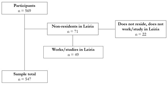 For sample selection, the following inclusion criteria were considered: (a) resident in Leiria. In case point (a) was not verified, the following criteria were considered: (b) work or study in Leiria. Out of a total of 569 responses to the online questionnaire, 22 responses were excluded. The final sample included 547 responses, as shown in Figure 1.