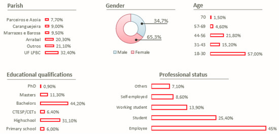 Regarding the characterization of the sample of 547 responses, the majority live in Leiria, Pousos, Barreira, and Cortes (32.4%) (Figure 2). Female responses are predominant (65.3%). Regarding age, there is a predominance of responses from ages between 18 and 30 years (57.0%), followed by ages between 44 and 56 years (21.8%).