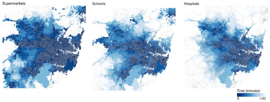 The first step of this approach is to define a research and policy question. The city’s vision builds on the idea that people aim to optimise their travel, budgeting for no more than one hour per day (see for example Marchetti, 1994 [63]); this figure has become a cornerstone of the Sydney Metropolitan Plan [64] and Sydney’s Future Transport Strategy [65]. Essentially, the idea is that that anyone within the city should be able to reach essential services and opportunities, such as employment, healthcare, recreational activities and education, within 30 min’ travel time (see Figure 2). As defined by the Greater Sydney Commission’s 30 min city indicator, their policy purpose is to measure: ‘the proportion of residents able to reach their nearest metropolitan centre/cluster or strategic centre using public transport and/or walking within 30 min’ [66]. This policy has inherent sustainability drivers too, in focusing on reducing travel time to within 30 min and thereby reducing the carbon footprint of a city induced by travel.