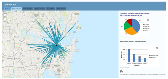 Using the ‘semi-interactive’ ESRI StoryMap platform, we developed a visualisation allowing users to select specific job destinations in Greater Sydney and review a series of related data analyses through graphs and maps. Visualising every origin-destination data point of the study area would lead to over-plotting, overlapping lines, and would overwhelm users’ perceptual and cognitive capacities. We therefore combined nearby stations and stops into the standard Travel Zone geography used for Census analysis and eliminated origins within Greater Sydney with less than five trips. The minimum threshold serves to reinforce the key findings while also acting to protect individual user privacy. Presenting the results of the 30 min city analysis in this aggregated form makes it possible to communicate the results via an online urban dashboard to government, industry and citizens. Such dashboards potentially encourage and support greater participation of citizens in the planning process [72].