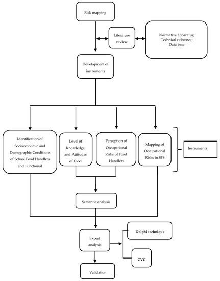 Occupational risk assessment in school food services (SFS) should include factors related to occupational hygiene, physical–functional planning, worker health, and good meal production practices. This study aimed to develop an instrument to assess occupational risk in school food services and perform content validation and semantic evaluation. The research included three steps: (i) instrument’s development; (ii) content validation (Delphi); and (iii) semantic evaluation (focus group). After an extensive literature review, four instruments were developed. The Delphi was validated by the Content Validity Coefficient (CVC), with an agreement greater than 90%. The semantic analysis was performed through four meetings using a focus group. After the content and semantic evaluation, there were four final instruments: Identification of Socioeconomic and Demographic Conditions of Food Handlers and Geographical Mapping of SFS (30 items); Knowledge and Attitudes in Food Hygiene Assessment (33 items); Perception of Occupational Risks (16 items); and Mapping of Occupational Risks in SFS (97 items). Instrument’s content validation and semantic evaluation contributed to constructing and validating forms for analyzing occupational risks and adjusting respondents’ language and sociocultural components.