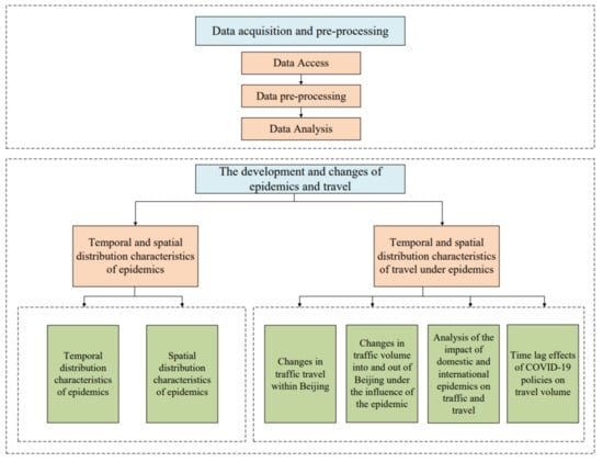 The results of the abovementioned studies suggest that in the post-epidemic era we should take advantage of the role of the transportation system as a link and transmitter in the normal functioning of all sectors of society. The two cases of the epidemic in Beijing selected for this paper provide a database for studying the impact of epidemic prevention and control measures on transportation activities, which can be used to study the mechanism of the impact of such strategies on travel during COVID-19. Based on the description of data sources in Section 3, the spatiotemporal distribution characteristics of the development of the Spring Festival and Xinfadi epidemics and their impact on traffic are discussed in Section 4, and the conclusions and limitations of this paper are presented in Section 5. Figure 1 shows the content structure of this study.