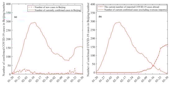Figure 3a shows the development of the novel coronavirus in Beijing from 20 January to 30 March 2020, including the current number of existing confirmed cases and the number of new cases in Beijing. Figure 3b shows the current number of confirmed cases, obtained after removing imported cases shown in Figure 3a.