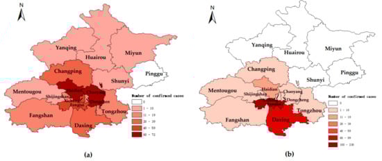 (a) Distribution of the number of confirmed cases of COVID-19 in Beijing by region in the Spring Festival pandemic, and (b) distribution of the number of confirmed cases of COVID-19 in Beijing by region in the Xinfadi epidemic.