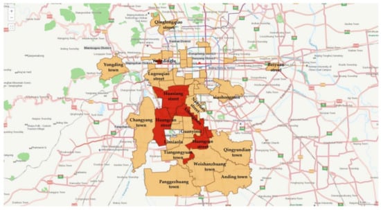 A total of 46 medium-risk and high-risk streets (towns) were involved in the whole epidemic outbreak in Xinfadi Market, as shown in Figure 6 (only partly marked). The area marked red is the range of five high-risk streets.