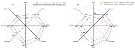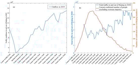 (a) Beijing’s inflow volume in 2019 compared to 2020. (b) Beijing’s outflow volume in 2019 compared to 2020.