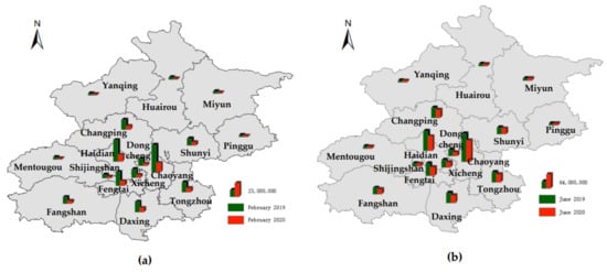 Comparison of traffic volume in each district of Beijing in February 2019 and 2020: (a) Spring Festival epidemic and (b) the Xinfadi epidemic.