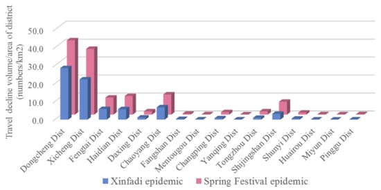 During the period of the Xinfadi outbreak, due to the implementation of restrictions such as booking and restriction of traffic during time slots and distant evacuation under the secondary response to major public health events, Dongcheng and Xicheng Districts, with a higher concentration of celebrities’ residences and places of interest in Beijing, experienced the greatest decrease in travel volume, 40.76 and 33.37%, respectively, compared to the same period in 2019. Fengtai District accounted for 68.7% of confirmed cases reported in the outbreak, with a 31.37% decrease in travel volume, and Daxing District ranked second in the number of confirmed cases, with a 26.06% decrease in travel. Shijingshan District, one of the central urban areas involved in the epidemic at that time, saw a 19.41% drop in travel volume due to its small footprint, small population base, and low percentage of cross-district travel volume (Figure 9).