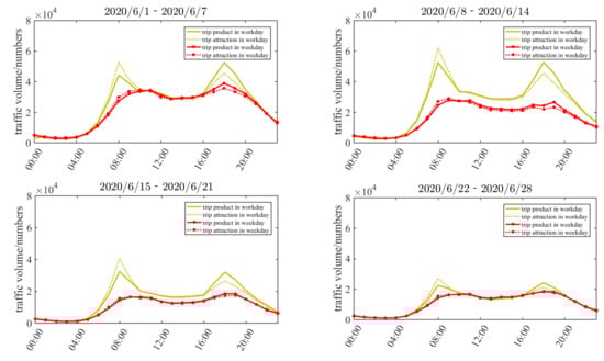 The daily travel cycle in the Huaxiang area under normal conditions includes significant morning and evening peak patterns during weekdays; the maximum of morning and evening peaks dropped significantly in the first week after the epidemic, but overall, significant commuting characteristics were retained, and commuting was weaker during weekdays in the second week after the epidemic (22 to 28 June 2020), as shown in Figure 11.
