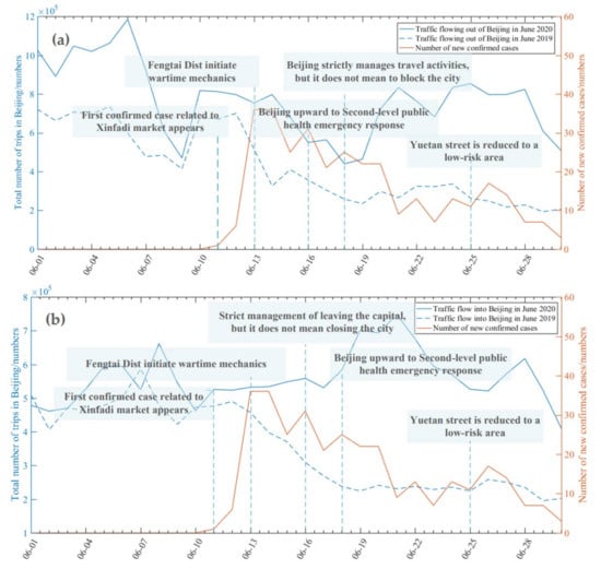 (a) Relationship between traffic volume to and from Beijing and new confirmed cases, and (b) relationship between traffic volume into Beijing and new confirmed cases.