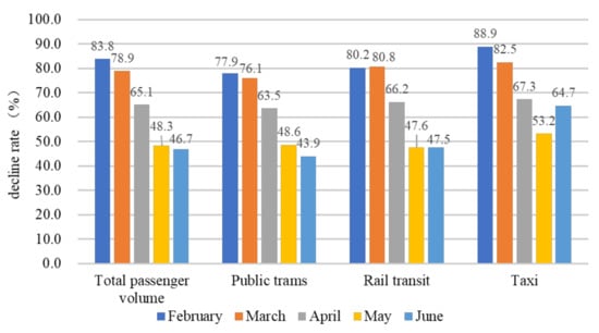 Meanwhile, there was also a shift in people’s travel mode choices during and after the epidemic. Combining the results of two samples from Beijing during the epidemic and the Spanish government [32] during the pandemic, people limited their choice of public transportation and more often chose to drive individually. According to data from the Ministry of Transport (Figure 14), passenger traffic in Beijing showed a significant decline in February when the epidemic was severe, dropping 83.8% compared to the same period the previous year. Total passenger traffic in Beijing in June was down 46.7% compared to the same month the previous year. After the implementation of restrictions in Spain, the proportions of people choosing private cars and walking greatly increased, and the proportion of people choosing public transportation was greatly reduced. People’s consideration of factors such as the safety of the transportation mode and the possibility of infection was an important component of the decline in public transportation use.