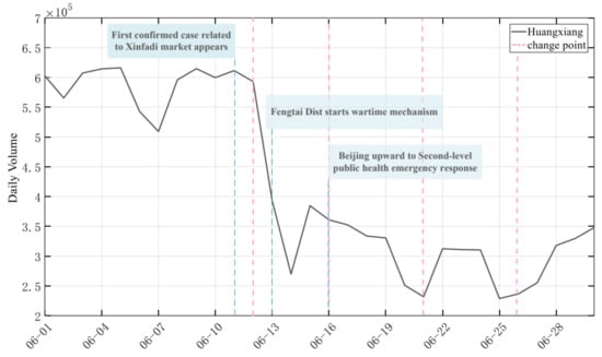 Each section between the two change points is in a stable trend. Due to the severity of the epidemic and the activation of the wartime mechanism in Fengtai District, and from 16 June to 21 June, Beijing announced that the public health level was raised to Level two, resulting in a continuous decline in traffic volume for five days. For example, after the outbreak began on 11 June, traffic began to drop on 12 June, with a lag of 1 day. From 11 to 13 June, a series of measures was introduced, such as suspending classes, closing a number of residential areas around the market, launching a wartime mechanism in Fengtai District, and flexible work from home, these led to a precipitous 50% drop in travel volume from the norm in the Huaxiang area. These drastic changes are uncommon in our transportation system. Understanding the delay effects over time can inform how long it takes for the impact of COVID-19 policies to be reflected in various transportation systems, and when transportation systems should prepare to adapt to these changes.