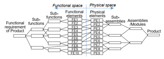 The next step for the designer is to map each FE to one or more physical element (PE). A PE is typically a single machine part that produces the corresponding function (FE). This step moves the designer from the functional space into the physical space. This mapping can be one to one, one to many, or many to one. In the physical space, multiple parts assemble into assemblies and the designer collects assemblies into higher level assemblies or modules until they all combine to a single node, the product. This product at the right end is the design solution to the product functional requirement at the left end.