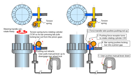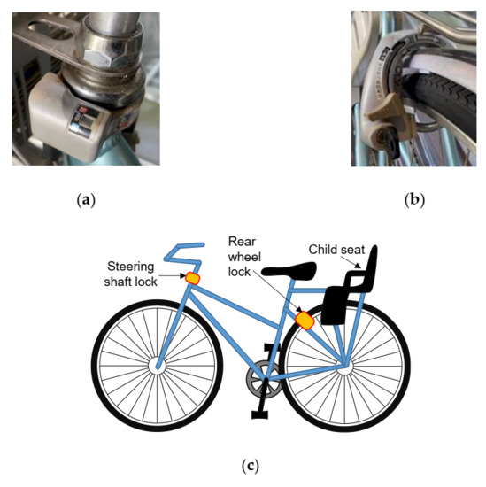 Bicycle with the “single action double lock” feature. (a) Lock that fixes steering shaft rotation [6]. (b) Lock that blocks rear wheel rotation [6]. (c) Typical locations of two locks on a bicycle.