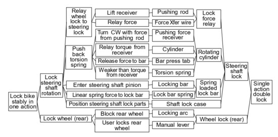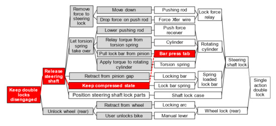 Figure 7 shows the “single action double lock” mechanism when the rider is riding the bicycle. This time, the rear wheel lock has to be disengaged and the steering shaft free to rotate. All parts in the DRG change their functions from those in Figure 5 including the higher level sub-functions to the overall function of “Keep double locks disengaged”. One exception is the “Shaft lock case”, with the function of “Position steering shaft lock parts”.