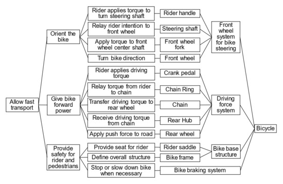 The above discussion is about how the “single action double lock” activates when parking. A rather more important function of a bike, however, is to ride it. Figure 6 is the DRG for the function of riding a bike. The figure does not have the detail of the braking system that has a number of parts, nor the detail of the locking system.