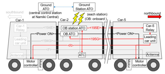 Figure 10 shows the five-car train except, Cars 3 and 4 are cut out from the illustration. The figure shows the controllers in the state of moving the train northbound, i.e., the proper travel just before the train reached Shin Sugita station. The single-line red arrows in the figure are control lines and, for this northbound travel, lines 195E and 195G and Control Line R were energized.