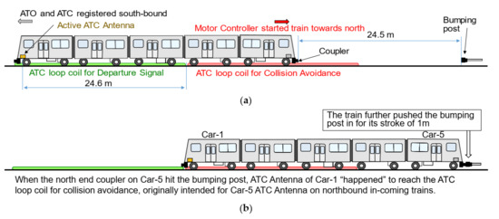 Figure 13 shows the train upon the wrong departure to its collision with the bumping post. When the train system started, it did not detect that it took off in the wrong direction. ATC, registered with southbound direction, detected its active antenna in Car-1 above the ATC loop coil for departure, a normal expectation for heading south. The train kept accelerating until the coupler of Car-5 hit the bumping post. When Car-5 collided with the bumping post, ATC antenna in Car-1 reached the south end of the loop coil for collision avoidance. This loop coil was there for the ATC antenna in Car-5 of incoming trains to detect overrun. The ATC system was not designed for trains starting off in the wrong direction, but, by a lucky coincidence, ATC engaged full brake.