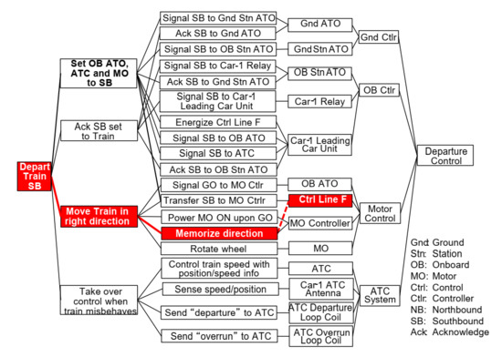 Figure 14 shows the DRG of the train control system in setting off the train in the southbound direction. The failure that caused the accident started from Control Line F failure in the physical space. The “Memorize direction” function of the motor controller needed the “Control Line F” to be properly working. Figure 14 shows this reliance with the broken red line segment. The failure propagated into the functional space to disable the overall functional requirement of “Depart Train Southbound”.