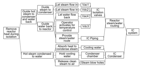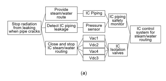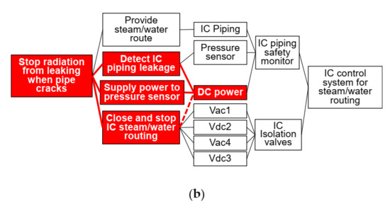 Figure 17b shows this dependence with a broken red line segment. The function of “Stop radiation from leaking when pipe cracks” needed “DC power” to the pressure sensor to be working properly; when the DC power was lost, the function activated improperly.