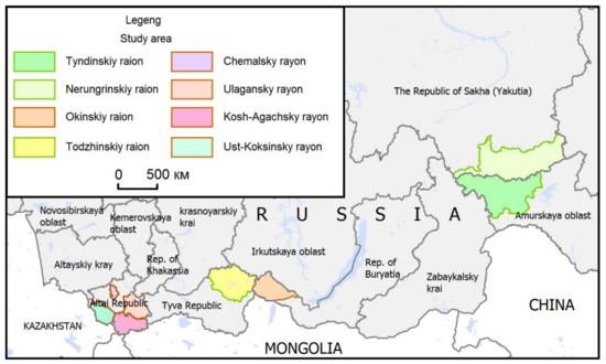 The administrative regions of our research are territories of five constituent entities of the Russian Federation: Todzhinsky kozhuun, Tyva Republic, Okinsky district, Republic of Buryatia, and Tyndinsky district, Amur region, Neryungri district, Sakha Republic (Yakutia), as well as the Altai Republic (Table 1). Allocation of municipal districts as equivalent cases, on the one hand, and the subject of the Russian Federation (the Altai Republic) is due to comparability of the areas of all the territories.