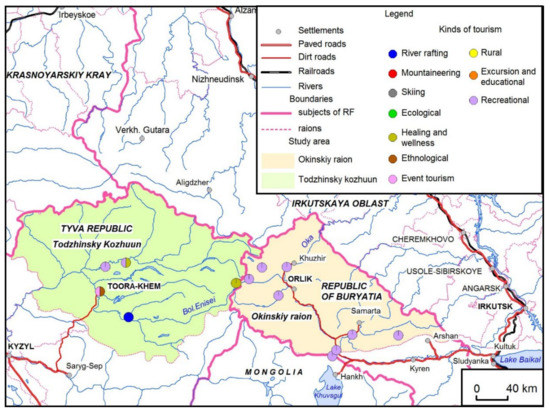 - Kuklina, M.; Trufanov, A.; Krasnoshtanova, N.; Urazova, N.; Kobylkin, D.; Bogatyreva, M. Prospects for the Development of Sustainable Tourism in the OkinskyDistrict of the Republic of Buryatia. Sustainability 2021, 13, 8042. [Google Scholar] [CrossRef]