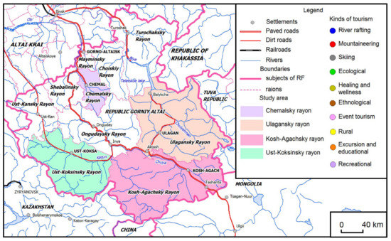 Due to more intensive tourism development in the Altai Republic and the multiplicity of manifestations in interaction of transport, tourism, and local population, the territory was studied in more detail with the use of a larger number of control points (seven villages in four administrative districts, namely Chemalsky, Ust-Koksinsky, Ulagansky, and Kosh-Agachsky).