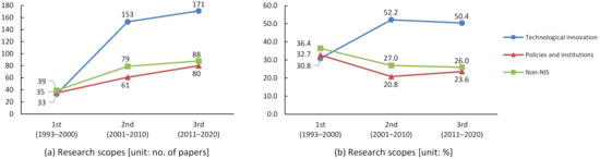 First, the research scope of IS shifted focus from building the NIS, the macroscopic perspective, to implementing it, the microscopic perspective. IS rapidly moved its research interest from research on policies and systems to research on technological innovation, and the amount of research increased significantly. It was confirmed that research on the promotion, deterrence, and source of innovation rose considerably, particularly in case studies. In addition, research is increasing, not only on the establishment of policies and institutions, but also on logical implementation and management of systems. Beginning in the 2010s through 2020, research on policy change has expanded, recognizing the need for a change in the existing NIS. Nevertheless, the attention on policy-making was still significant overall, indicating that the focus of IS did not wholly step away from the macroscopic perspective.