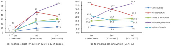 Sub-categories of technological innovation [unit: no. of papers (%)].