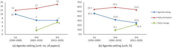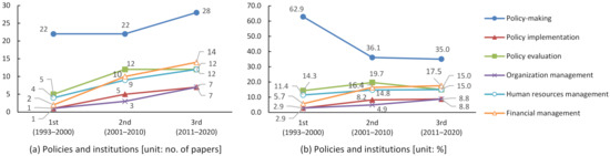 The first phase tended to be more geared toward the policies and institutions of the NIS. In contrast, research on technological innovation increased significantly until 2020, although the difference is not dramatic (Figure 3). This finding was in accord with the argument that the government’s role is crucial in enhancing the innovative capacity of the NIS at the national level. It could also be said that IS provided the knowledge required for the government to establish policies and develop institutions, supporting the establishment of the NIS. Increasing research related to technological innovation from 2001 to 2020 seemed to be affected by growing interest in the technological innovation activities of individuals and organizations after the NIS in Korea stabilized.