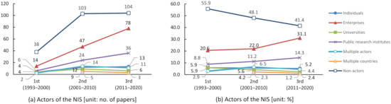 Second, it is essential to study the interactions among various actors of the NIS, from individuals to the state. It cannot be denied that enterprises are key actors in economic growth. However, the role of each actor and the active interactions among them are more emphasized in an NIS, and as the NIS evolves, changes in the roles and capabilities of actors are essential factors [69]. As such, research should be further expanded to address the changing and enhancing of actors’ roles and capabilities, as well as to address linking of different functions and capabilities among actors.
