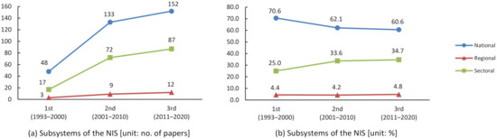 In the 1990s, IS was introduced in Korea. After the 2000s, several studies attempted to elucidate the intellectual structure of Korea’s IS using bibliometrics, but no research analyzed IS from the perspective of NISs. Table 2 shows the findings from the analysis of research subjects of papers published in Korean academic journals related to IS. However, because the region is limited to Korea, it seemed challenging to identify influential researchers such as Martin or Fagerberg and their works in reference to citation indexes in order to analyze the status of IS. It is perhaps for the same reason that Lee [48] analyzed all the papers published in the chosen journal when he attempted to study the progress of IS in Asia, mainly focusing on Korea. Additionally, an existing study examined scientific innovation and NISs based more on web data than academic journals [49].