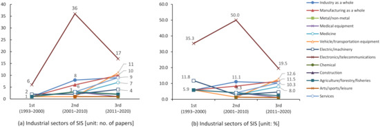 Next, as shown in Table 9, the sub-categories of the content-based aspect can be divided into regional innovation systems (RIS) and sectoral innovation systems (SIS) as well as the NIS. To further discuss at the sectoral level, SIS were further divided into sub-categories of industrial sectors and technological sectors. The categories were selected in reference to Korea’s National Science and Technology Standard Classification System [56], but some sub-categories have been grouped together.