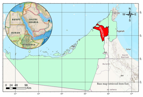 This study focused on Sharjah, one of the seven emirates of the UAE. Sharjah has a total population of about 1.28 million and has an area of about 254 km2 (Figure 1). The use of mass transport in Sharjah remains limited despite the availability of a public bus system, with most Sharjah residents using personal vehicles or private taxis. Sharjah city is connected to the adjacent city of Dubai, with a large portion of Sharjah residents commuting to Dubai for work and entertainment. As a result, the Sharjah–Dubai transportation links are typically highly congested during rush hours.