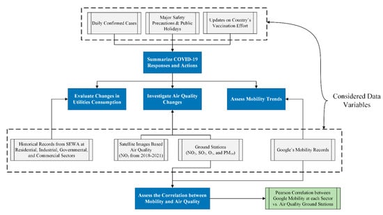 The mobility, air quality, and utility consumption data used in this study were obtained from various sources. The Google Community Mobility Reports (GCMR) data were obtained from Google [36], which shares the mobility data with the community to facilitate research and studies related to the pandemic. The available data covered a period starting 2020 onward across four different sectors: retail and recreation, grocery and pharmacy, parks, transit stations, workplace, and residential. The mobility data show changes in mobility on any day during the pandemic relative to the average mobility of the same day during the five weeks before the pandemic (3 January to 6 February 2020) [37]. For example, the mobility of Tuesday, 6 July 2020 was compared with the average mobility value of all Tuesdays from 3 January to 6 February 2020.