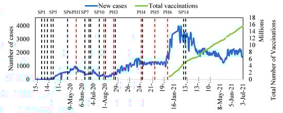 The first confirmed COVID-19 case in the UAE was recorded on 29 January 2020. As the number of cases gradually increased, the government started implementing SP to contain the spread of the virus among the population. Table 3 provides a detailed overview of the implemented SPs since the pandemic’s beginning [39,40,41,42,43,44,45,46,47,48,49,50,51,52,53,54,55,56,57,58]. In addition to the SPs, the PHs are also included as they affect mobility and air quality and utility consumption. Figure 3 shows the daily trend of confirmed COVID-19 cases in the UAE, with the vertical lines corresponding to the SPs and PHs indicated in Table 3.