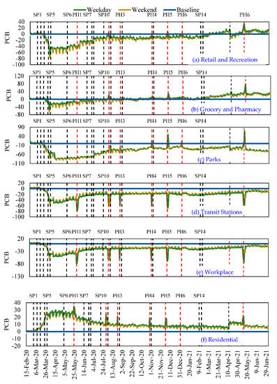Overall, the GCMR data adequately reflected the safety measures (SP) and public holidays (PH) identified in Table 3. The data reflected the dramatic changes in mobility in the various sectors during the early stage of the pandemic from March 2020 and the gradual recovery afterward. The decline in mobility in five of the six assessed sectors was accompanied by an equivalent increase in the residential sector.