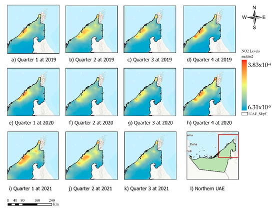 NO2 Levels retrieved from Sentinel-5P satellite images for the years 2019–2021.