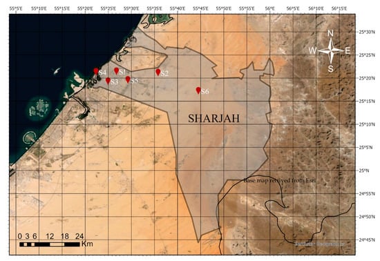 Figure 6 shows the spatial distribution of the six air quality monitoring stations operated by the Bee’ah company in Sharjah. Five of the six stations are within the built residential and industrial areas of the city and the sixth station is located outside the built area. The station S1 is in an urban area close to a road, S2 is in a suburban area, S3 is in an area zoned as industrial, S4 is in an urban area with mostly single detached buildings, S5 is located within a university campus, and S6 is located far from the city in a newly established neighborhood and is surrounded by detached villas and some construction sites. It should be noted that station S4 gave inconsistent data and therefore was discounted from the analysis.