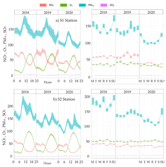 Another set of air pollution trends is shown in Figure 7b for station S2. Station S2 is in a suburban area that is mostly away from industrial and recreational activities. The NO2, O3, and SO2 measurements at S2 exhibited similar trends and comparable levels before, during, and after the pandemic Figure 7b). However, the PM10 showed a slight decrease in 2020 (on hourly, monthly, and weekly levels) compared to the other measurement periods. Figure 7c shows the air pollution measurement at the S3 station in an industrial area. As a result of its location, the air pollution level in this area was higher than its levels in the other areas. In 2020, and despite the implemented lockdown measures, the air quality as measured at the S3 station did not improve significantly. The only parameter that showed improvement is the PM10, specifically during March–July of 2020 as compared to the same periods of 2018 and 2019.