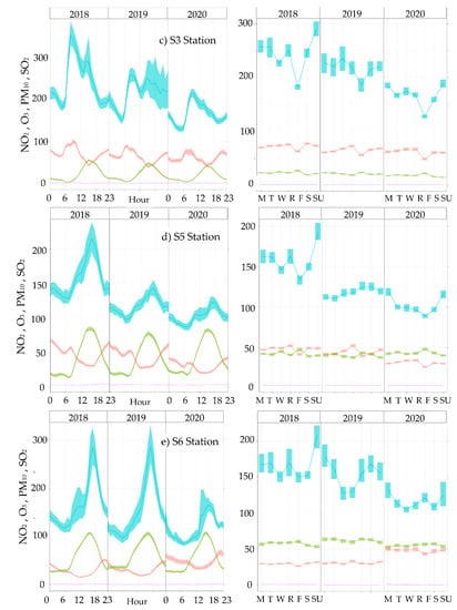 Lastly, Figure 7e shows the air pollution records at the S6. As shown, the O3 and SO2 did not change significantly during the years 2018 to 2020; however, the NO2 levels increased slightly where the PM10 decreased in 2020.