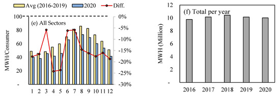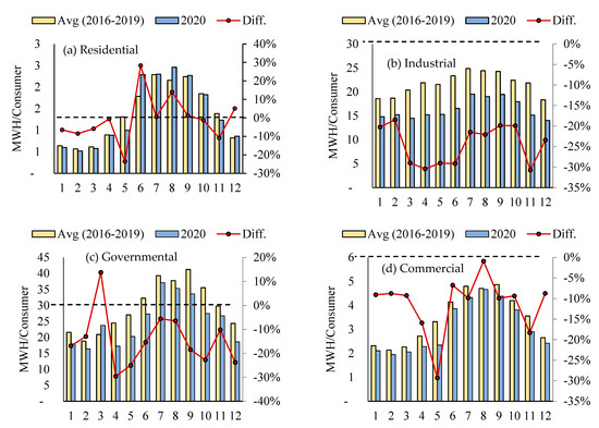 Figure 8 shows the electricity consumption per consumption unit (ECCU) in Sharjah during the period 2016–2020. In Figure 8a–d, we compare the average monthly utility consumption during the years 2016–2019 with the monthly consumption during 2020’s COVID-19 lockdown period. As illustrated in Figure 8a, the residential ECCU was slightly higher during the summer of 2020 (June–August) compared to the average of 2016–2019. The increase in summer consumption may be related to restrictions on international travel, as a significant portion of the UAE population typically spends the summer vacation, which corresponds to school and university summer vacations, outside the country.