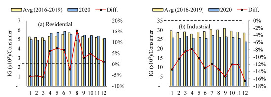 This section analyzes the utility consumption trends before and during the COVID-19 pandemic. The consumption data were normalized by the number of consuming units (i.e., apartments, villas, buildings, and firms) in the city.