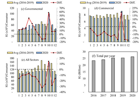 Figure 10 shows the temporal gas consumption per consuming unit (GCCU) in Sharjah for the period between 2016 and 2020. The residential GCCU (Figure 10a) was lower than the average of previous years until May, then it surpassed the average of previous years until the end of the year. Figure 10b shows that GCCU in the industrial sector was lower throughout 2020 compared to the average of previous years. For the governmental sector (Figure 10c), the GCCU in 2020 was lower than the average of previous years except for in April and November. In the commercial sector (Figure 10d), the decline in GCCU became steeper from April 2020, which was just after the implementation of COVID-19 precautions, compared to previous years.