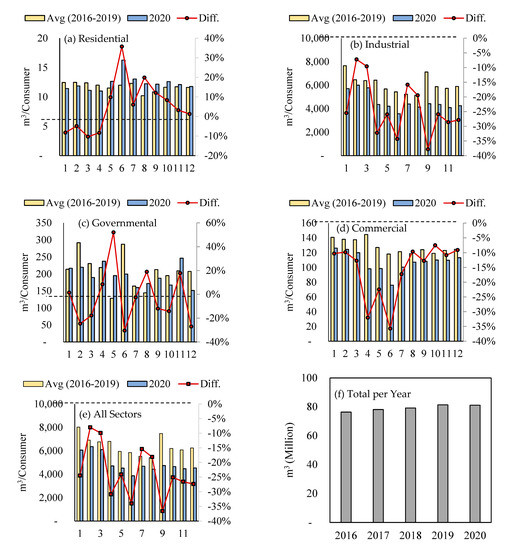 Water consumption in the industrial sector was lower throughout 2020 compared to the average of the previous years (Figure 9b). The impact of COVID-19 on water consumption in the sector was not clear from the data, although the reduction in water consumption following the pandemic increased compared to the reduction before the pandemic. In the governmental sector, the WCCU from January to July in 2020 was higher than the average of the previous years for the same period (Figure 9c). From July to September 2020, the WCCU declined below the average of the previous years. As presented in Figure 9d, the WCCU of facilities within the commercial sector observed a drop in consumption starting February 2020 until October 2020.