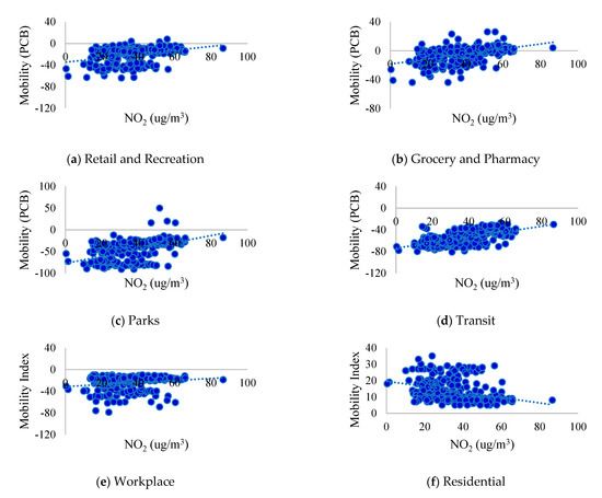 The air quality data measured by the various air monitoring stations are closely related to transportation activities. As discussed in the previous section, the pandemic did not result in major changes in electricity, water, and gas consumption in Sharjah. On the other hand, mobility was significantly affected in each sector. Therefore, the observed improvement in air quality during the lockdown in 2020 appears to be closely related to a reduction in traffic volume and changes to mobility during the pandemic. Figure 11 shows the mobility trends, expressed in terms of percentage change from the February 2020 baseline (PCB), versus NO2 levels for the S1 air quality monitoring station. The data indicate that the NO2 levels reflected the increase and decrease in mobility in the various mobility sectors during the pandemic. The lower mobility values were associated with the lower measured NO2 levels. For example, as the mobility in the residential sector increased during the pandemic, reflecting the fact that more people stayed in their homes, while the NO2 levels decreased due to lower mobility for outside activities.