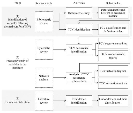 The work is divided into three main stages: (1) identification of variables affecting thermal comfort, (2) frequency study of variables in the literature, and (3) identification of devices to capture the variables. Figure 1 shows the tools, activities, and deliverables for each of the stages this research addresses, where the acronym TCV refers to “thermal comfort variables”.