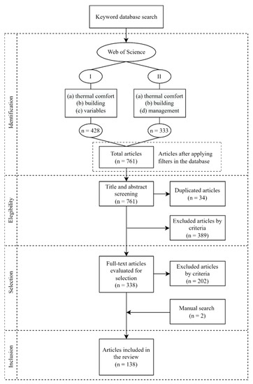 For the first phase, the keywords and the database for the search were chosen. The Web of Science database was used to obtain the articles in this study since it offers a wide variety of disciplines related to the topic to be addressed in this work. The keywords selected were (a) thermal comfort, (b) building, (c) variables, and d) management. Thus, combinations I (“thermal comfort” AND “building” AND “variable”) and II (“thermal comfort” AND “building” AND “management”) were used to search for articles. Then, a series of filters was applied in the database to work with the study areas of interest to evaluate articles in this work, corresponding to (1) construction building technologies and green sustainable science technology and (2) civil and environmental engineering. Additionally, a filter was applied with the time of publications from 2001 to the present, giving 761 articles.