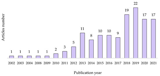 Figure 3 shows the annual distribution of publications of the selected articles. The 138 articles are distributed according to their year of publication, ranging from 2002 to 2021. Thus, it is possible to observe a trend in the increase in article publications from 2013 onwards. Then, it is visualized that the number of publications does not vary greatly, ranging between 8 and 10 annually; however, they have increased considerably since 2018.